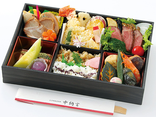 「中納言のお弁当」は、合成保存料、防腐剤、着色料、発色剤などを調理過程で使用しておりません。 中納言ならではの伊勢海老、国産牛や旬の野菜をふんだんに使い、料理人がひとつひとつ丁寧にお作りします。