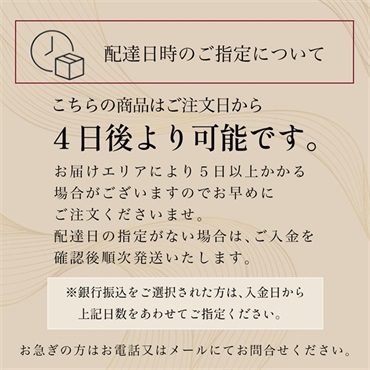 ご注文日から1週間以内にお支払いください。入金確認後の商品発送となります。振込手数料はお客様負担とさせて頂きます。